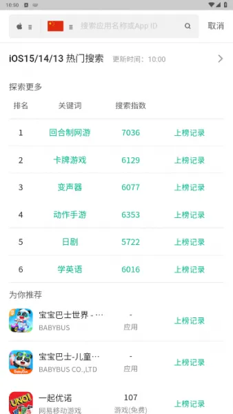 提供iOS&Android双平台榜单实时查询,最新排名、变化趋势、竞品榜单动态一网打尽,且数据更准确、更全面 。