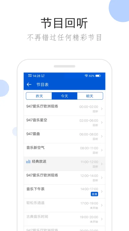 9、支持广播回听功能,包括昨天,今天和明天的节目单,让你不错过任何精彩节目;