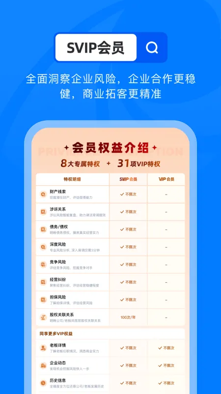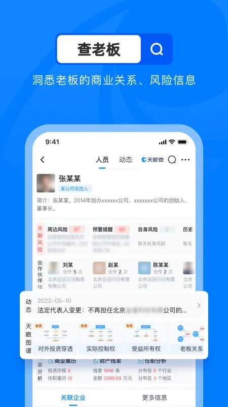 作为老板和商务精英首选的商查神器,天眼查覆盖百余种应用场景,天眼一下,面试不被骗,跳槽不被坑,机会更靠谱,决策更放心。查老板信用、资本关系、企业商机、潜在风险,就用天眼查!