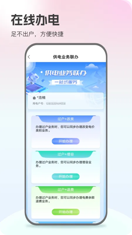 一证、一网通办:APP将新装办电“线上化”,可随时线上办电。精简线上办电流程:APP同步上线电子签章、办电进度查询和催办、企业资质库、营商环境政策发布等功能,办电流程更便捷、办电信息更透明。