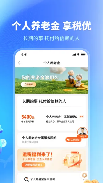 福享太平app是太平养老保险股份有限公司推出的数字化官方服务平台,集成保单查询、在线投保、理赔申请、客服咨询等核心功能,为用户提供便捷高效的保险服务。用户可随时随地查看保单详情、了解保险条款,还能获取专业保险规划及理财建议。平台界面设计简洁直观,操作流程流畅便捷,交互体验轻松愉悦,让保险服务触手可及,助力用户轻松管理保障计划,享受智慧养老金融新体验。