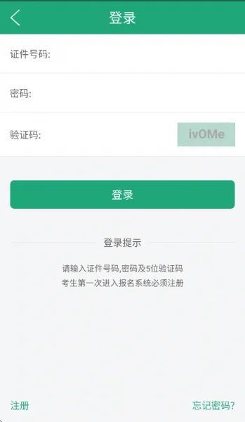 考生进入登录页面,输入注册时使用的证件号码、密码及验证码,点击登录按钮,登录网上报名系统。