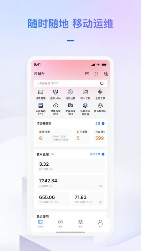 阿里云App,阿里云官方出品,满足您随时随地触达阿里云的需求。您可以购买、管理云资源,监控产品数据,接收报警,与阿里云AI助理进行咨询对话,与人工客服沟通等。安全、便捷、快速,帮助您在手机中掌握阿里云的服务。