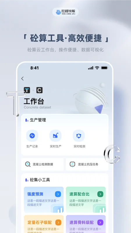 “砼算云”是一款专为商砼行业设计的应用程序,该程序旨在通过实时数据监控、智能配合比优化以及多种实用工具的集成,帮助用户降低原材料成本,实现生产过程质量可控。作为公司整体解决方案的重要组成部分,“砼算云”充分利用AI学习算法和大数据技术,为用户提供精准检测数据、智能配合比优化支持和后台管理窗口。
