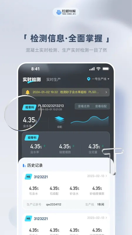 “砼算云”能够实时检测生产批次的原材料数据,如骨料级配、含水率和含泥量等。所有检测结果均被精确记录,为企业提供可靠的质量控制基础。