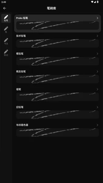 2、笔刷库:包含铅笔、笔、书法、标记四大类型及数十种笔刷种类;