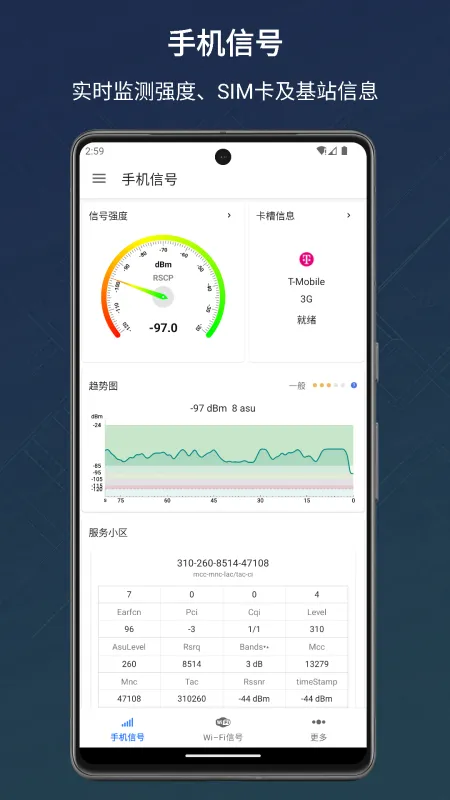 手机信号监控:实时追踪手机信号强度,一键查询SIM卡及运营商信息。深入探索基站服务,包括服务小区、邻近小区及网络位置区等高级数据,助您优化手机网络环境。