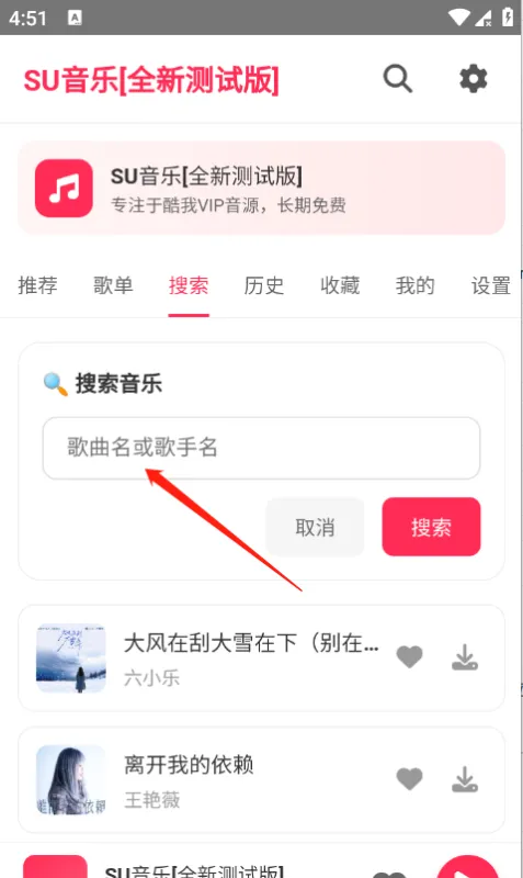 1、搜索音乐:在App首页或搜索栏中输入歌曲名、歌手名或歌词片段,进行音乐搜索。