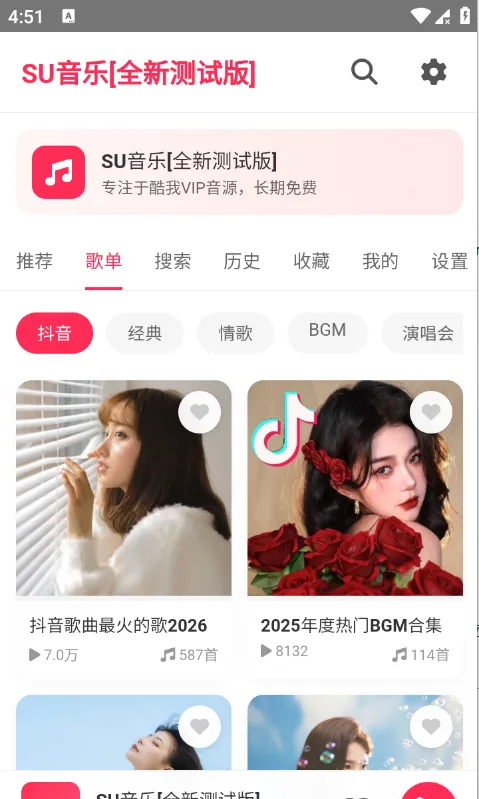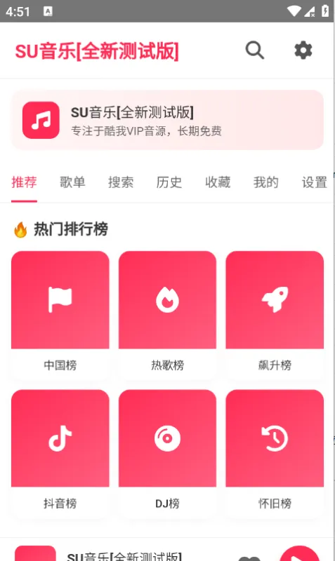 SU音乐App是一款全新上线的免费高品质音乐播放工具,内置智能搜索引擎与覆盖全网的海量曲库,支持精准关键词、歌手、歌名一键检索,所有歌曲均可无损免费畅听。界面简洁、操作流畅,真正实现‘想听就听’的极致体验,是当下不可多得的高性价比音乐神器。