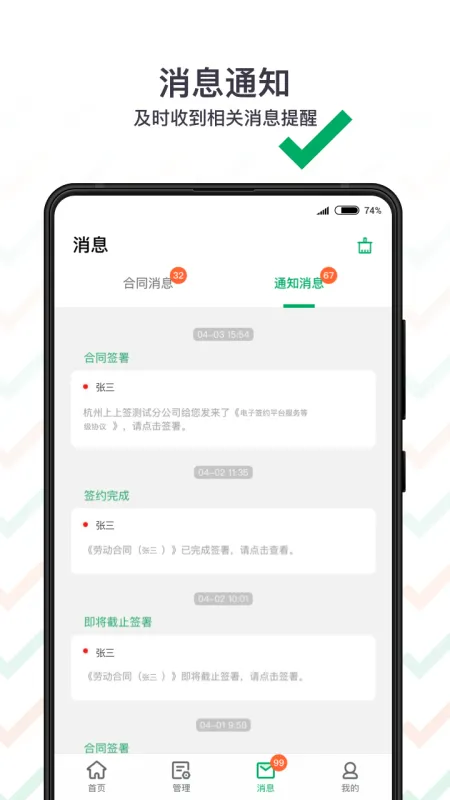 文档签署过程中和确认签名时,均有系统消息通知到用户,避免误签、冒签。