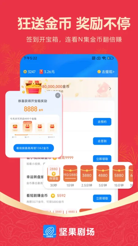 坚果剧场是一款融合短剧追更与戏剧美学的轻量级娱乐APP,聚合重生逆袭、古风穿越等多元热门短剧,全集免费、高清流畅,专为碎片时间打造;独创‘看剧赚金币’‘任务打卡’等互动玩法,让用户边追剧边收获真实收益,轻松开启视听与回报双丰收的观剧新体验!