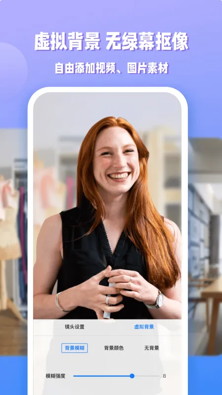 可选择背景模糊、纯色背景或自定义图片作为虚拟背景,调整模糊强度或透明度以优化效果。