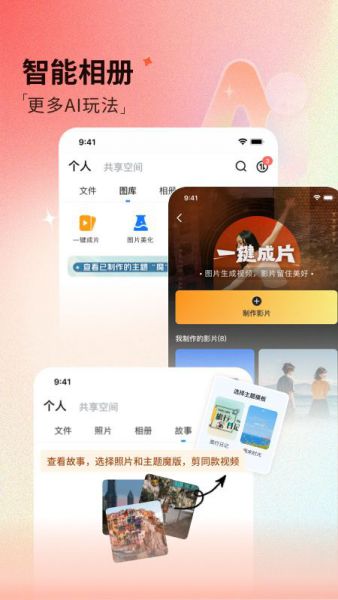 AI相册可实现云端照片的智能分类管理,用户可自建爱情、旅行等主题相册,宝宝相册AI自动识别本地照片智能整理。系统会自动生成美食、周末、节假日等故事,选择故事照片和主题模版生成故事视频,美好如约而至。