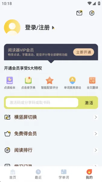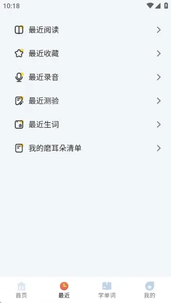 软件拥有首页,最近,学单词,我的等板块,涵盖了丰富的英语阅读学习资源,可以帮助用户随时随地阅读学习提升英语
