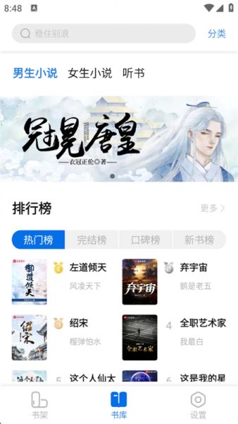 4、首页设有推荐、更新、新书等清晰分类,涵盖有声小说、相声评书、广播剧和音乐等多种类型。热门小说一应俱全,满足不同用户的多样化需求。
