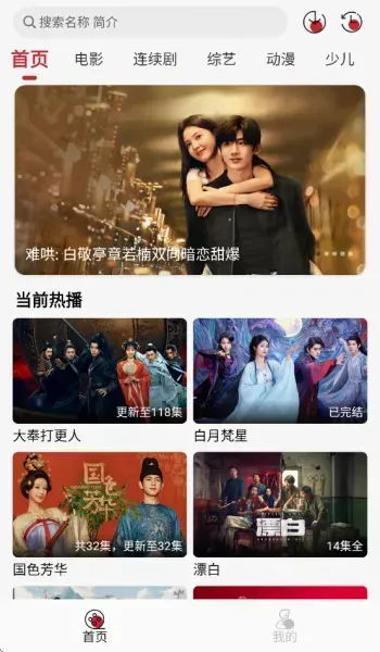 进入app首页,可以看到推荐、电影、连续剧、综艺、动漫、少儿多个栏目;