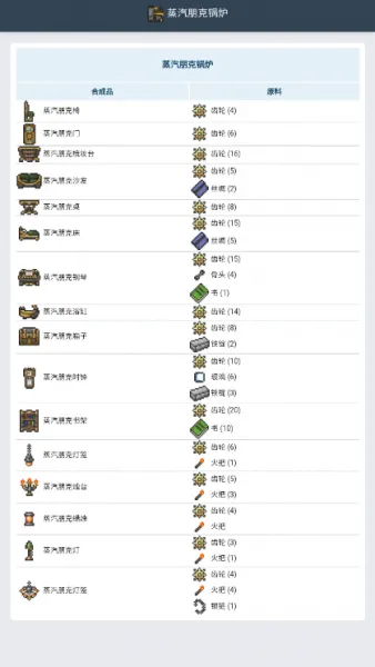这是《泰拉瑞亚合成表》的核心功能。无论是基础工具、强力武器,还是药水与饰品,所有游戏中需要合成的道具都一一列出。每个合成项目都包含了详细的原料信息、合成步骤以及相关的工作台(如工作台、熔炉、炼药台等)要求。这样,玩家可以根据材料信息直接查看合成方法,轻松制作自己所需的道具。