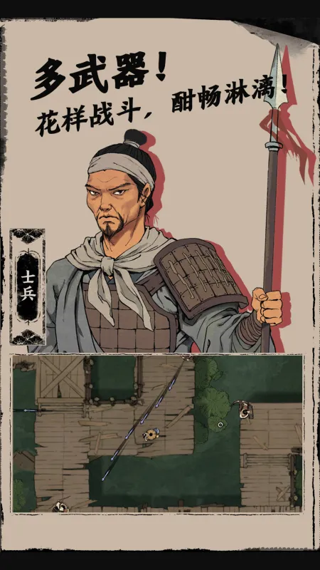 1、首先简单介绍一下末刀的一些基本情况,末刀手游中一共有五个关卡,关关挑战都不同,其次玩家需要知道我们面对的对手是谁,游戏中的敌人(NPC)分为四种人:分别是持刀兵、持盾兵、持弓兵和炸弹兵,顾名思义,这也属于这四种对手所持的兵器,熟悉对手才方便玩家相对应对其进行攻击。