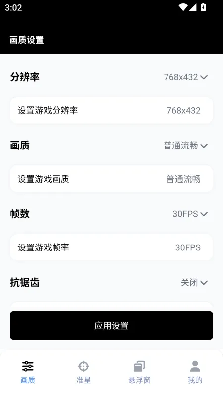 2、进入画质页面,可以一键优化画质,还能自定义分辨率、画质、帧数、抗锯齿等设置