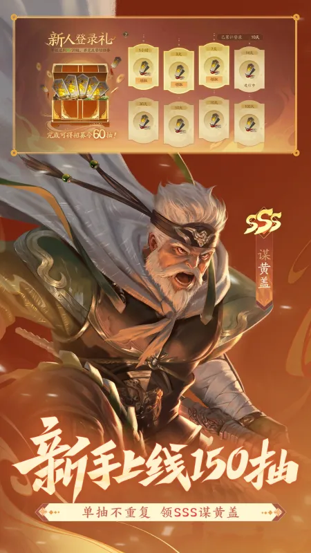 新用户上线领 150 抽!现在登录更有SSS级武将谋黄盖(永久)赠送!