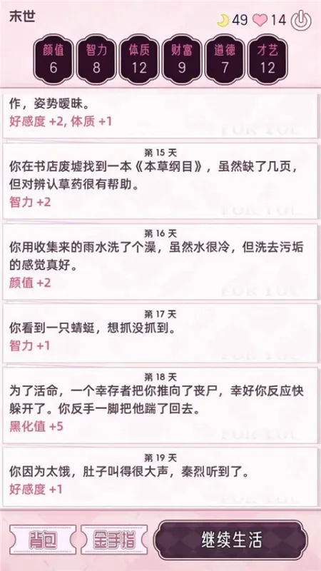 5、点击继续生活能推进剧情,和看小说一样。