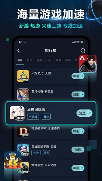 热门游戏全覆盖,支持3000+手游加速,吃鸡游戏,apex英雄、PUBGM、使命召唤战区、DNF、王者荣耀国际服、绝地求生:刺激战场、刺激战场、吃鸡外服、蛋仔派对、胜利女神NIKKE、夜鸦国际服、星之后裔、罗布乐思、steam+chat、鹅鸭杀,暗区突围国际服、跑跑卡丁车、我独自升级、阿斯达年代记、渡鸦2、火炬之光无限、TWITCH、SwitchOline、炉石传说、王权之忆、英雄联盟手游、飞机大厨、咒术回战、宝可梦大集结、战地手游、瓦罗兰特手游、剑灵2、明日之后、碧蓝档案、云顶之弈手游、方舟生存进化等一键智能加速。
