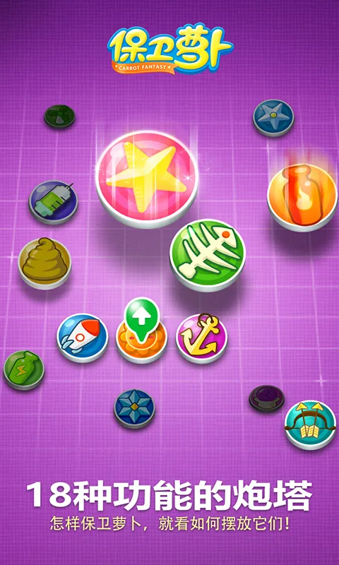 4、18个风格独特的防御塔,鱼刺塔、太阳花、便便塔、船锚塔……更多花样等你探索~